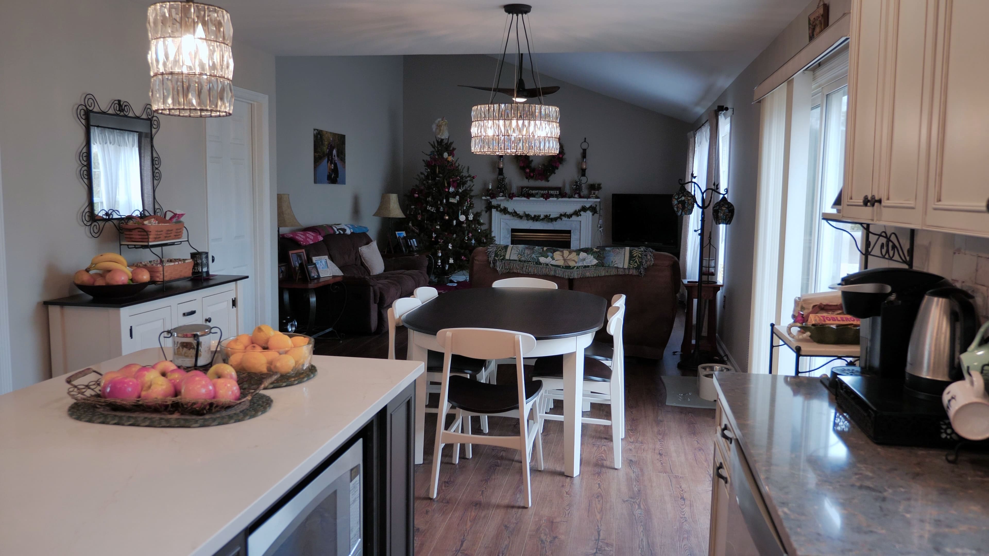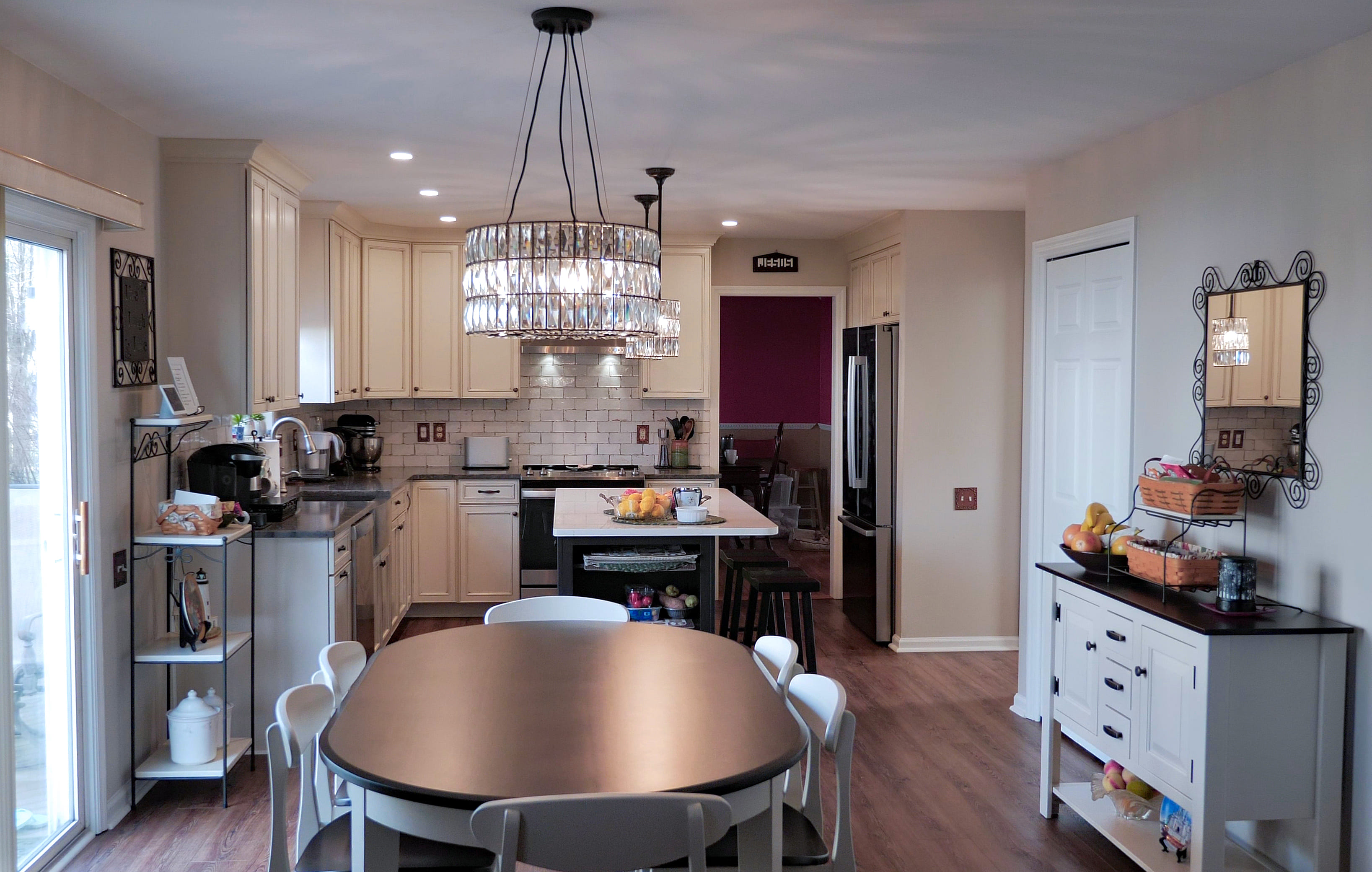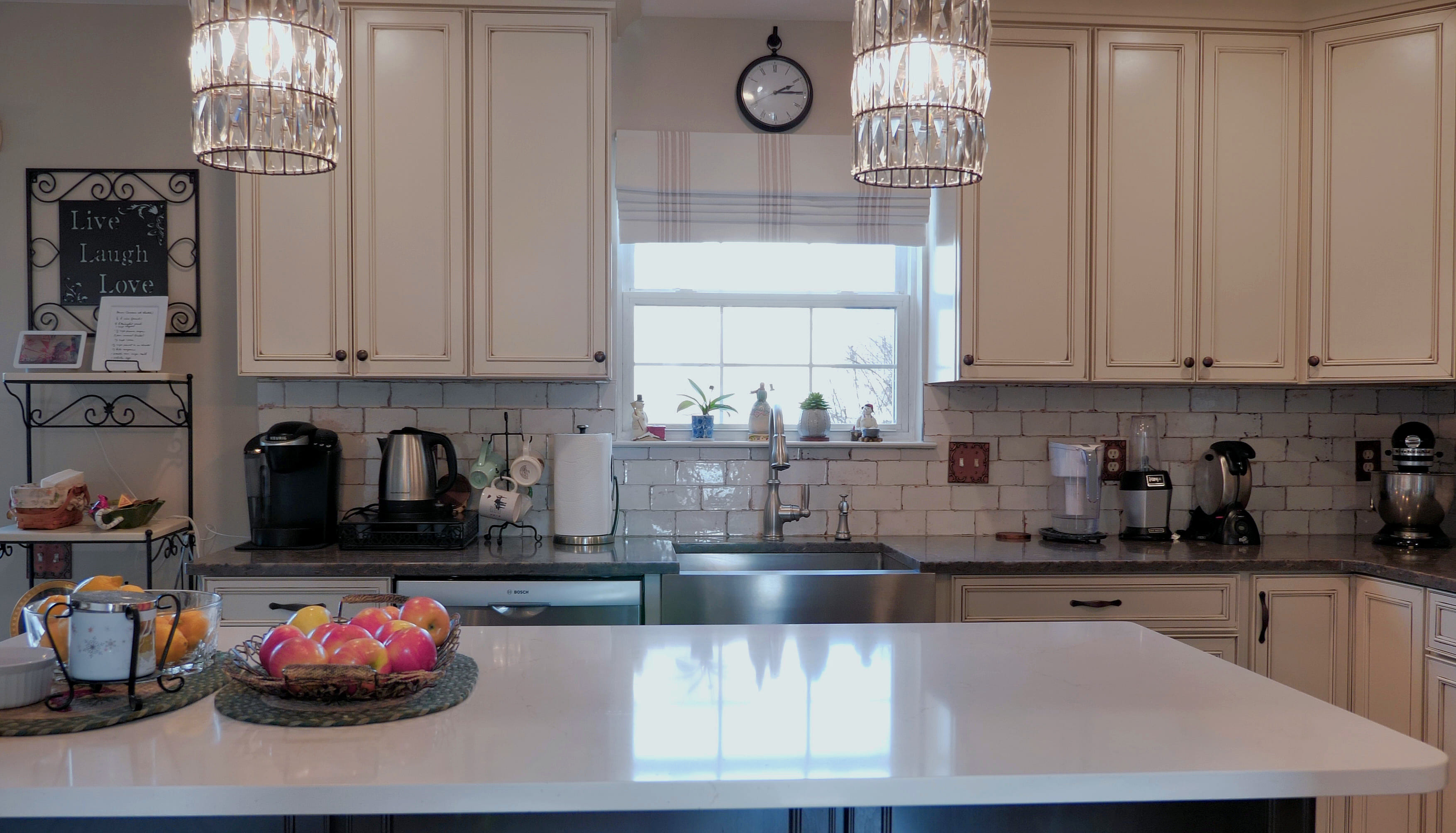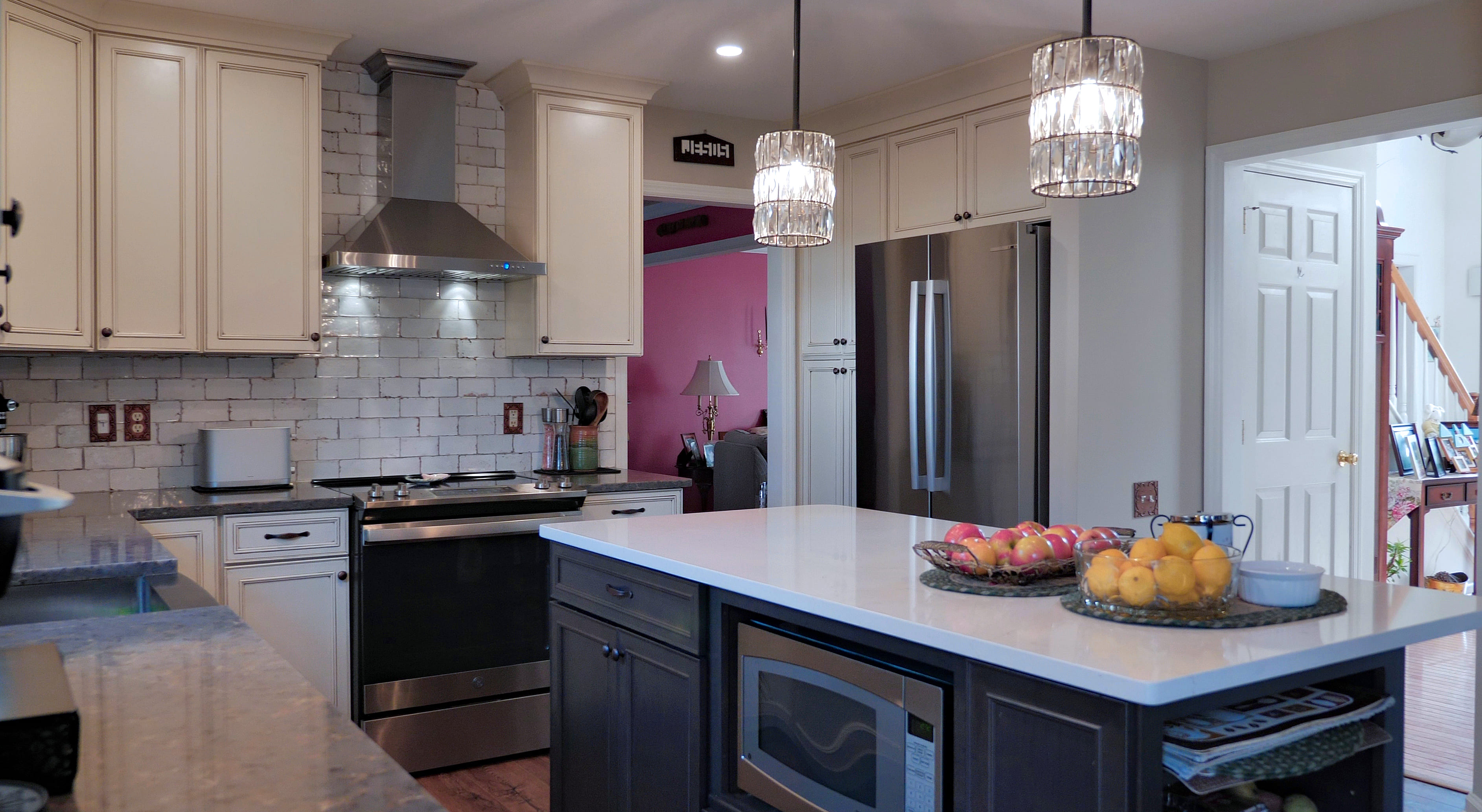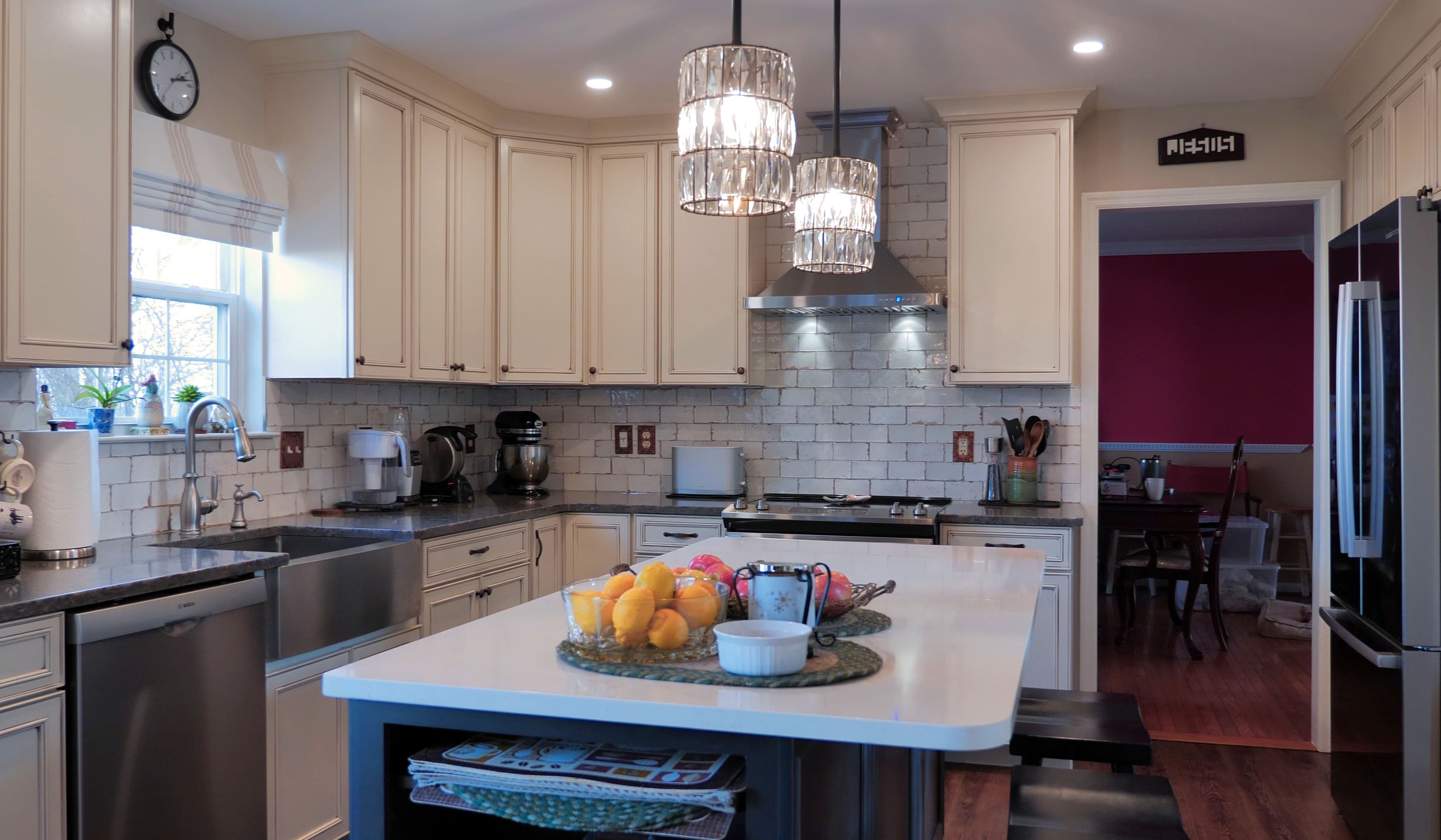 This beautiful kitchen features classic white cabinetry paired with a contrasting island, creating a timeless and elegant look. The subway tile backsplash and pendant lighting add character and warmth to the space. The spacious layout and functional island make the kitchen both practical and inviting.
