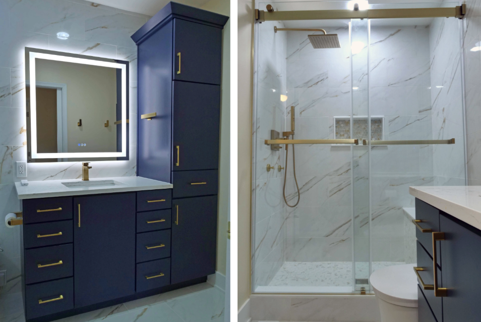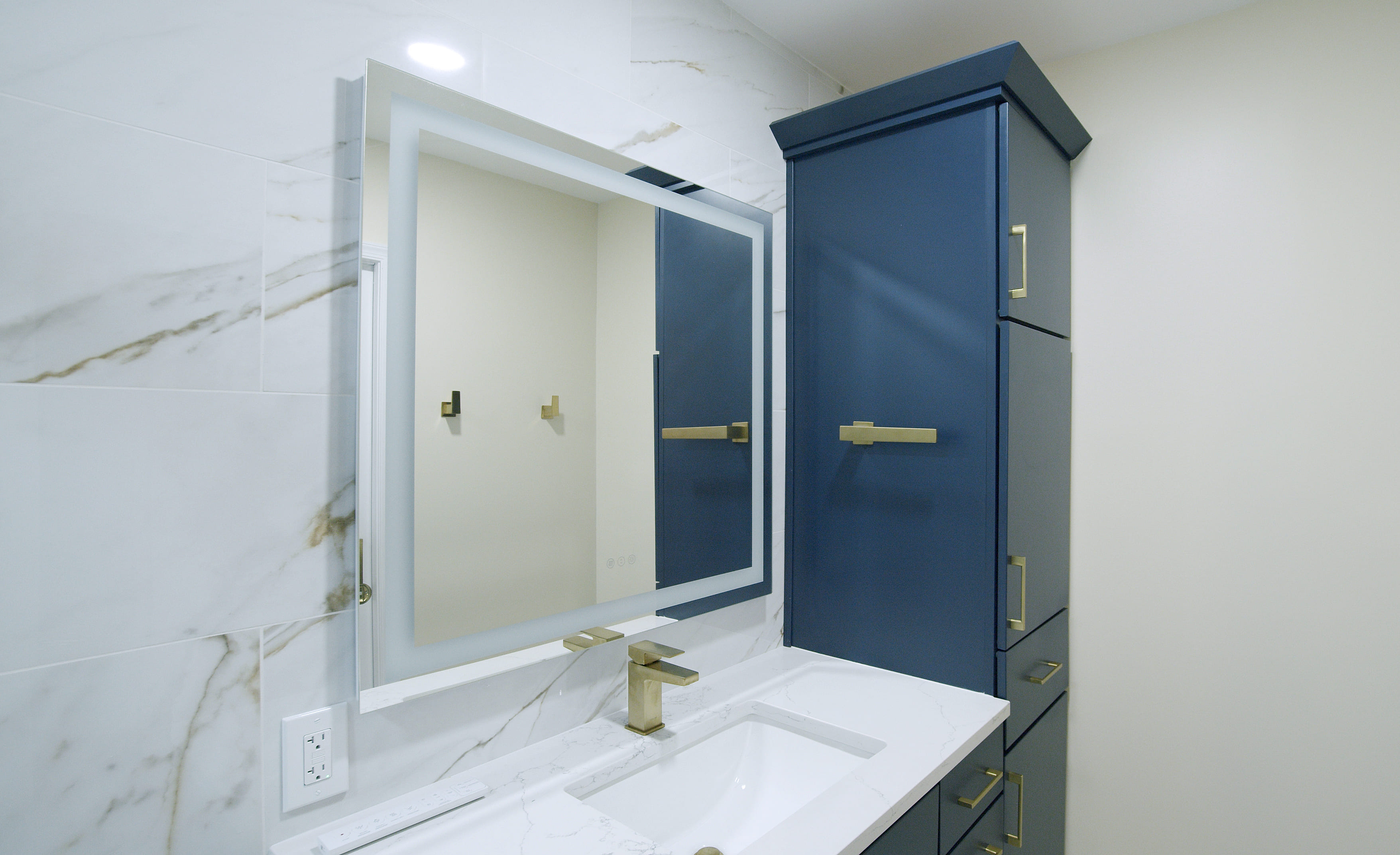 This bathroom features stunning blue cabinetry paired with gold faucets and matching handles, creating a luxurious yet functional space. The illuminated mirror adds both style and practicality, while complementary tiles complete the design, enhancing the overall aesthetic.