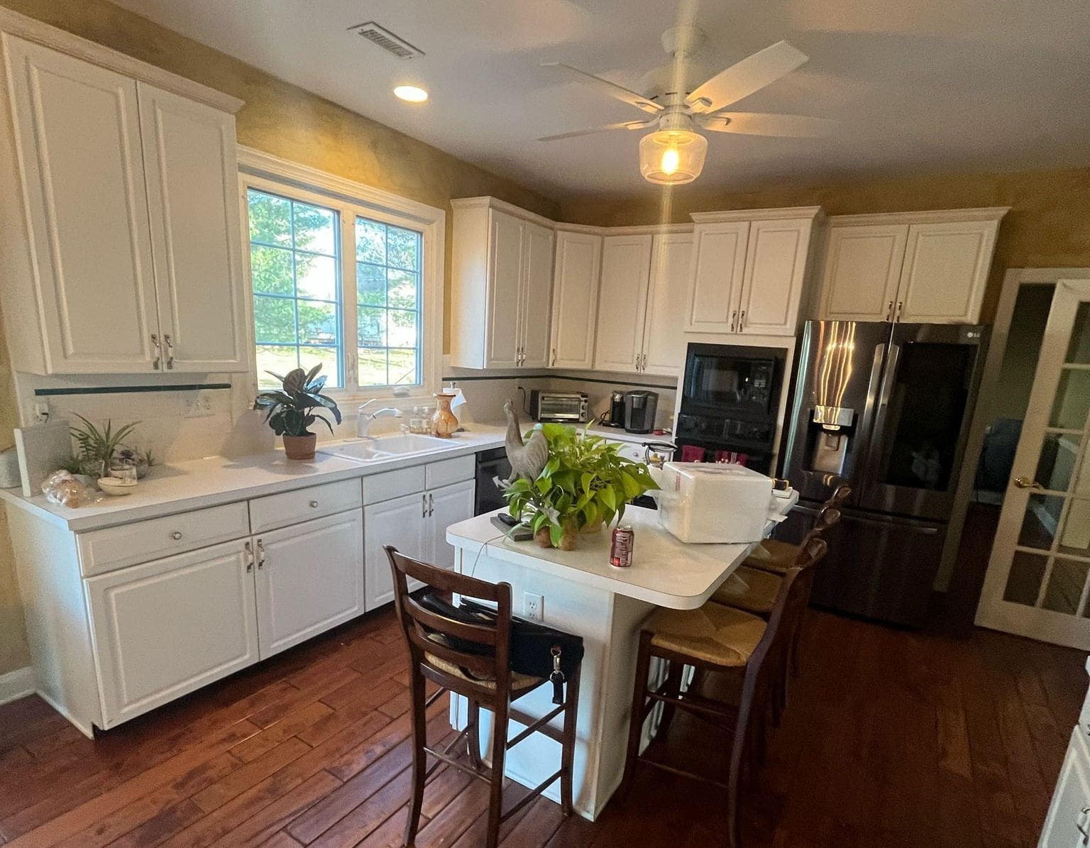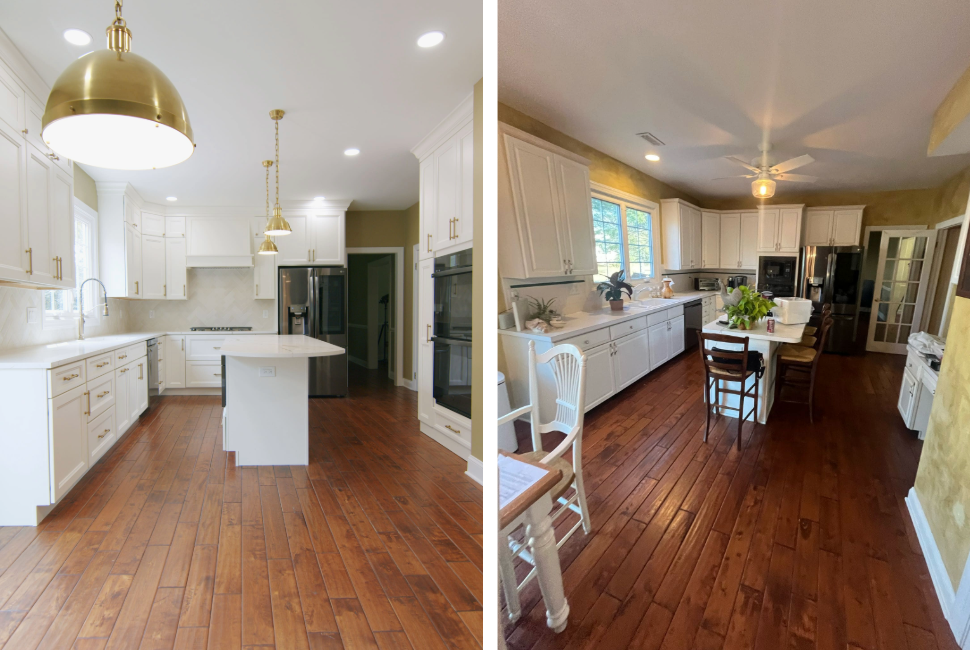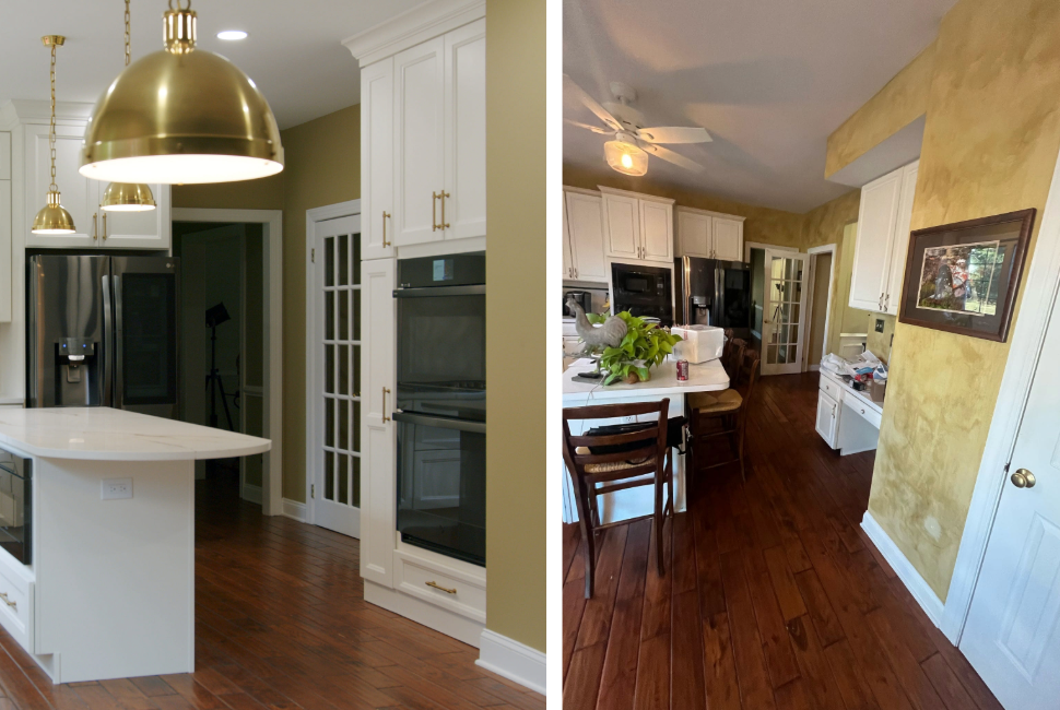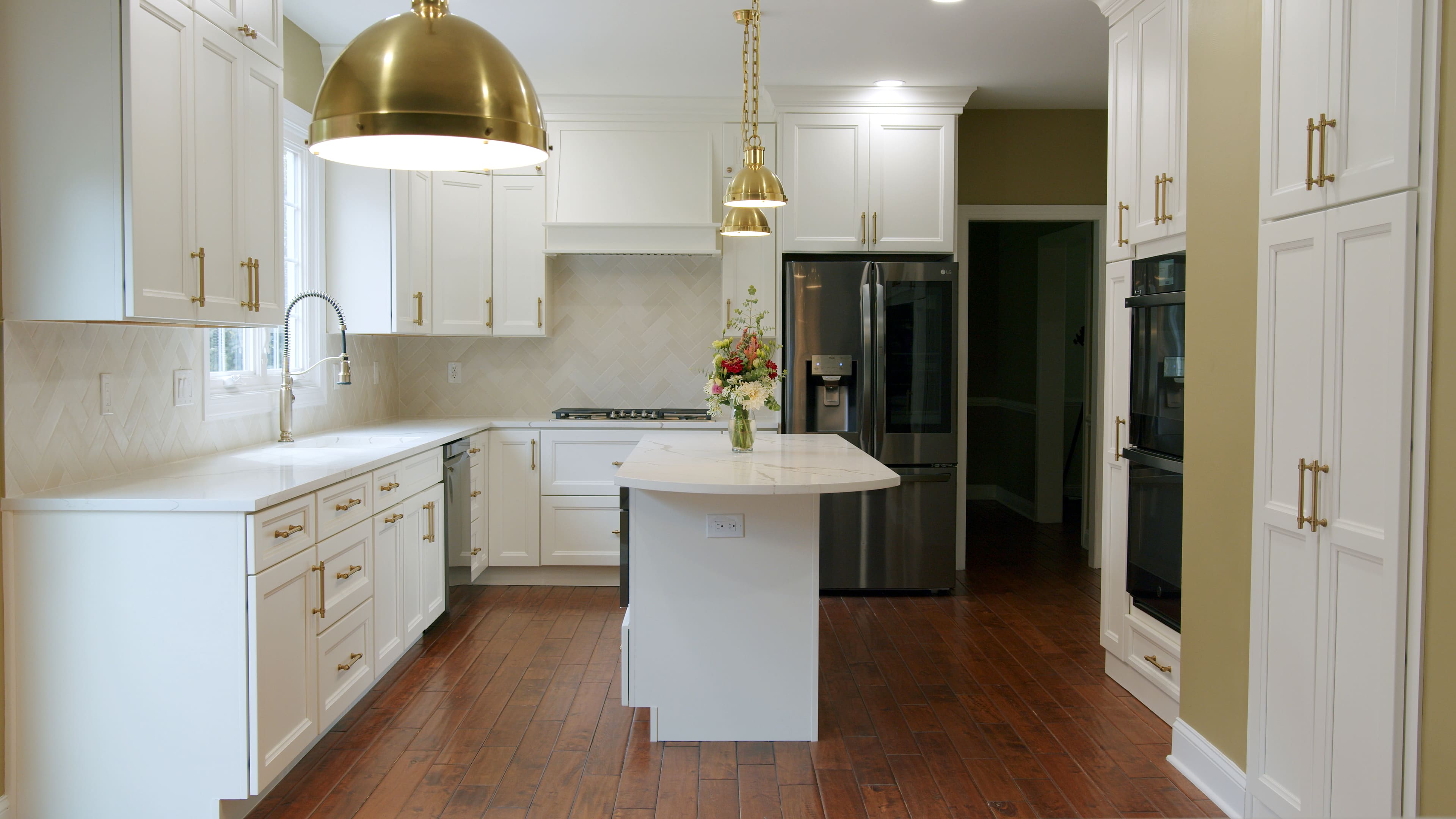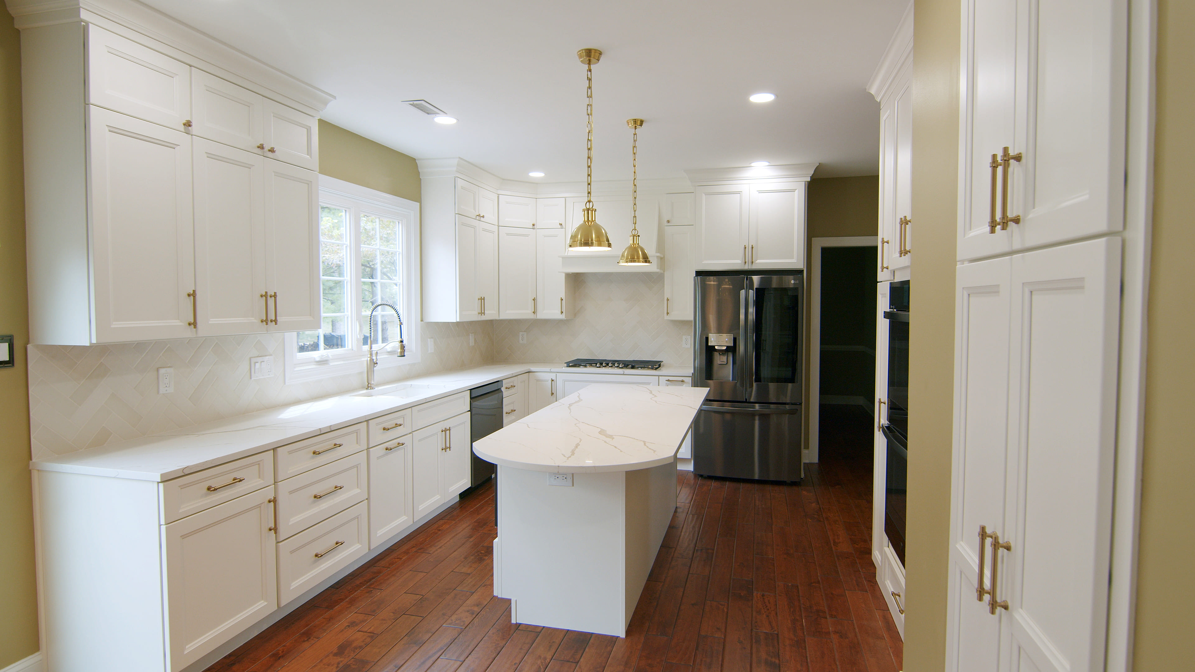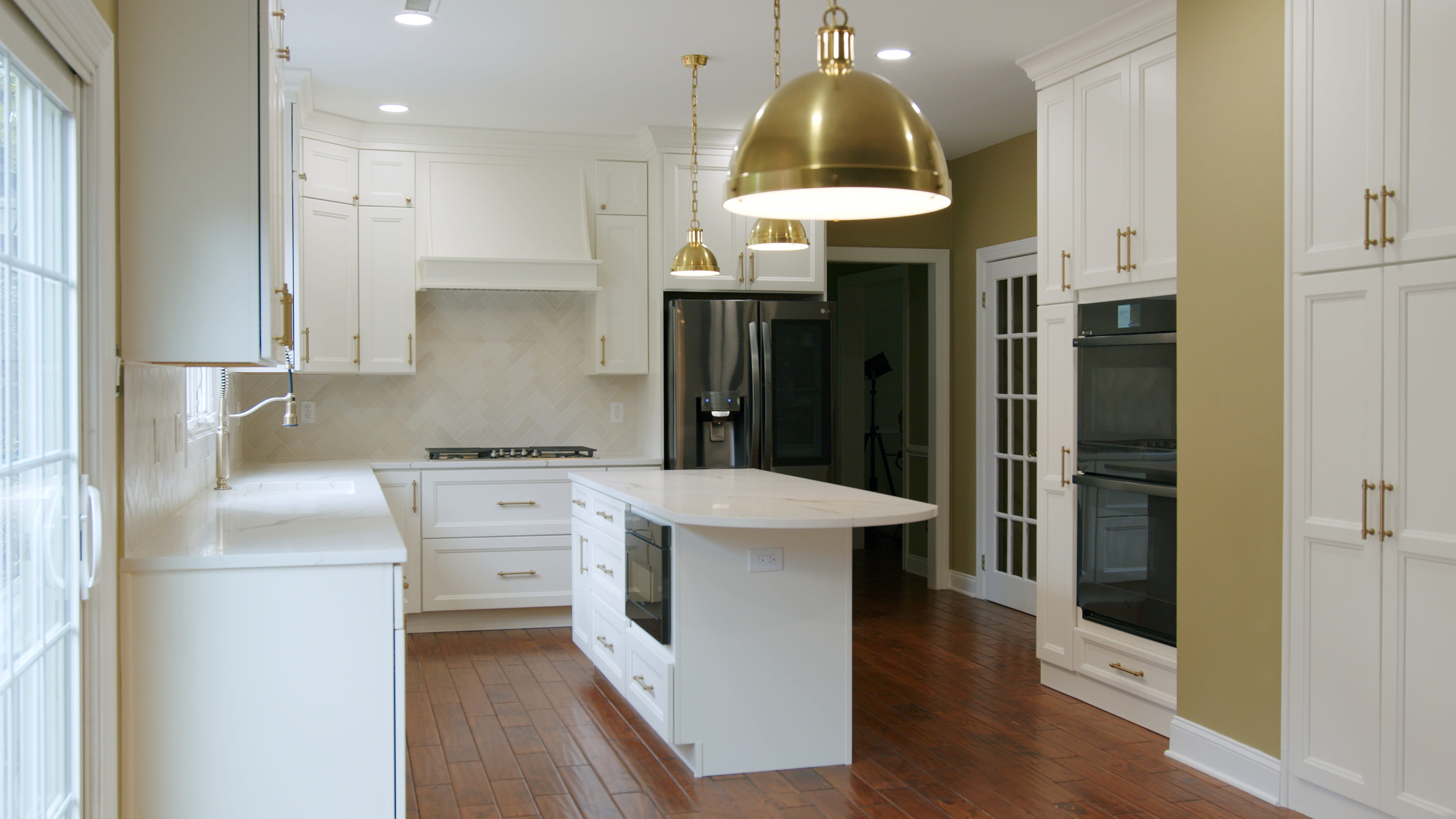This kitchen features elegant white cabinetry paired with a matching island, creating a clean and cohesive look. Gold pendant lighting adds a sophisticated touch and enhances the overall design. Ample storage and the bright layout result in a stylish and inviting kitchen.