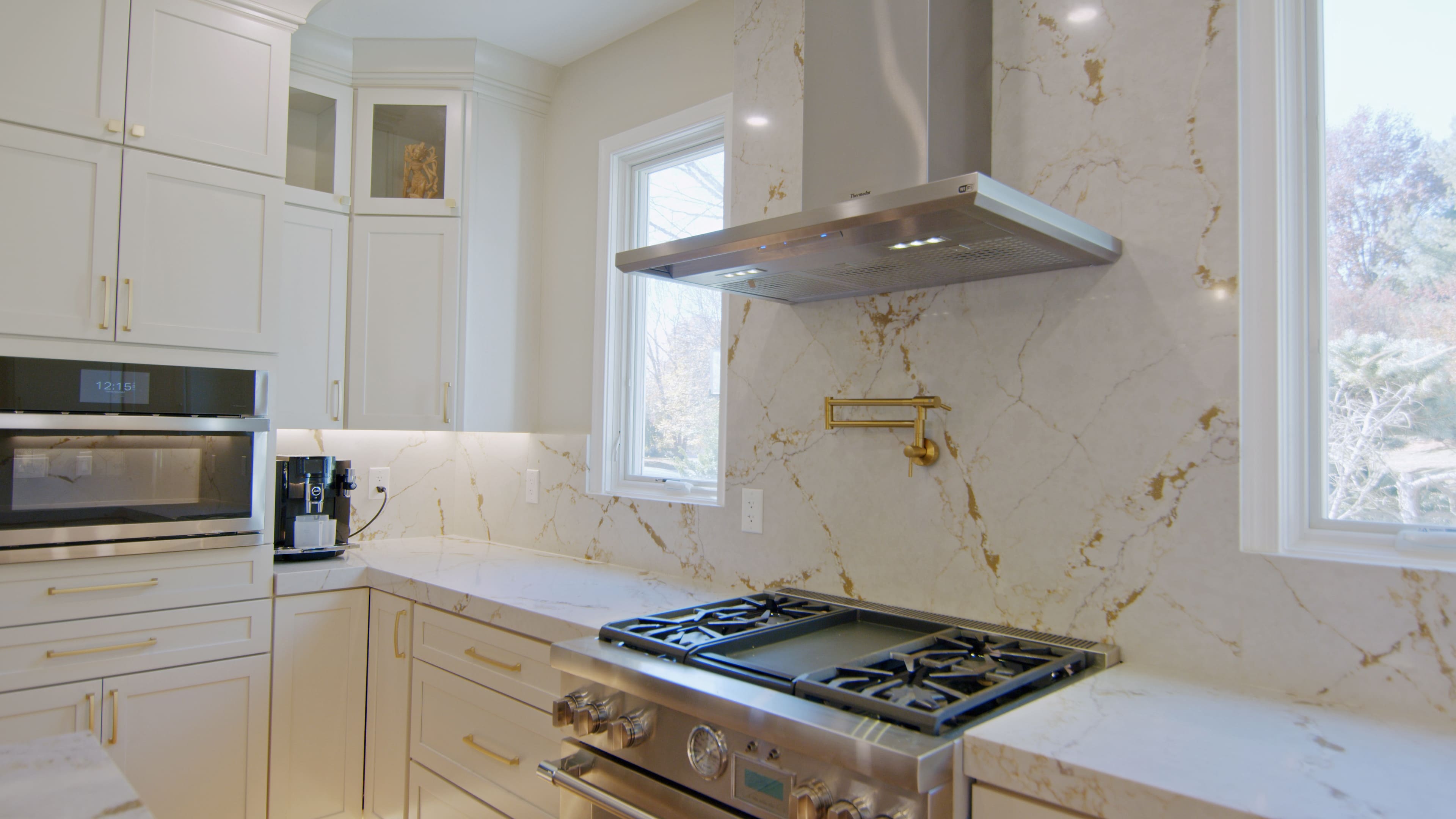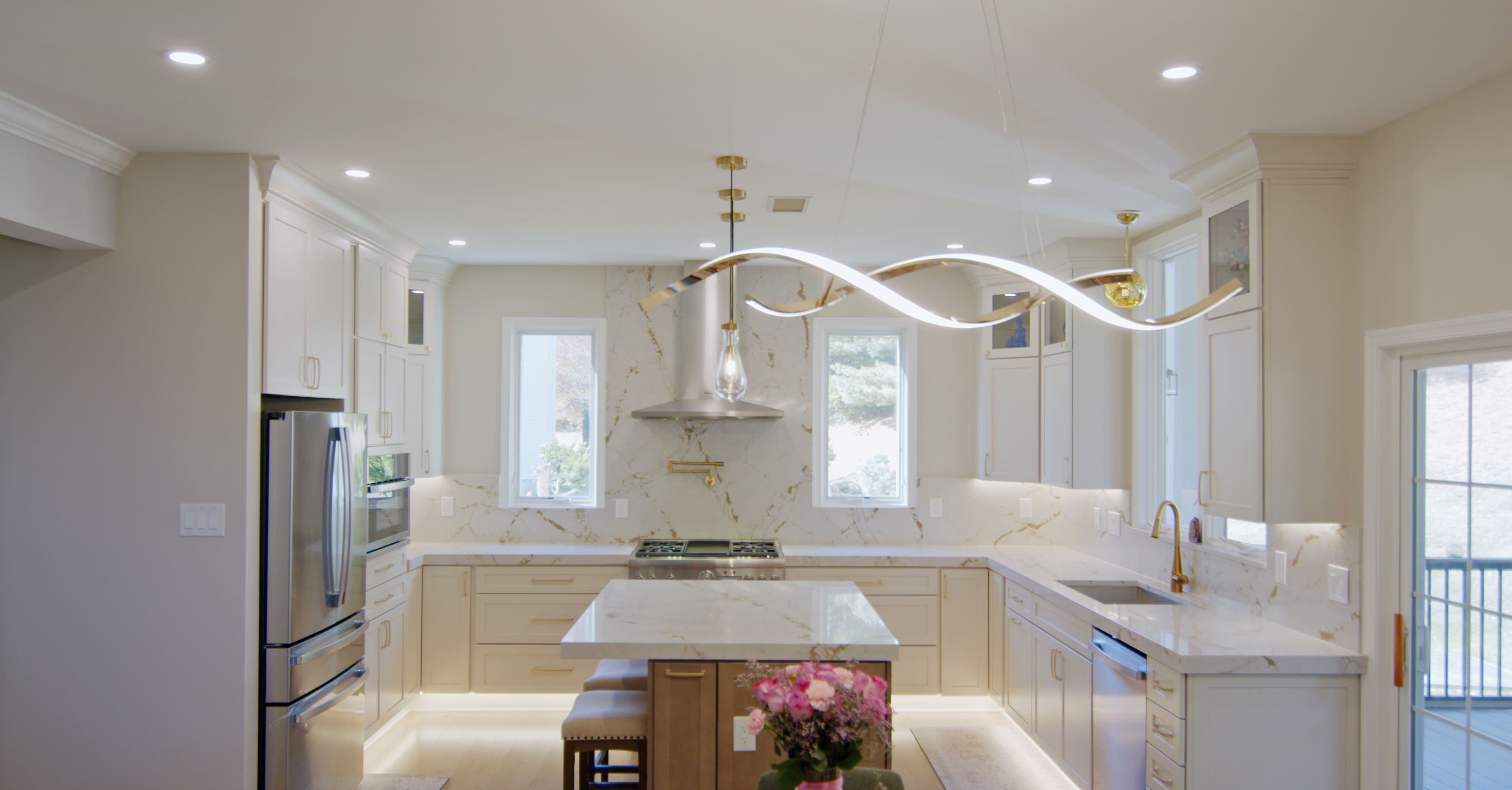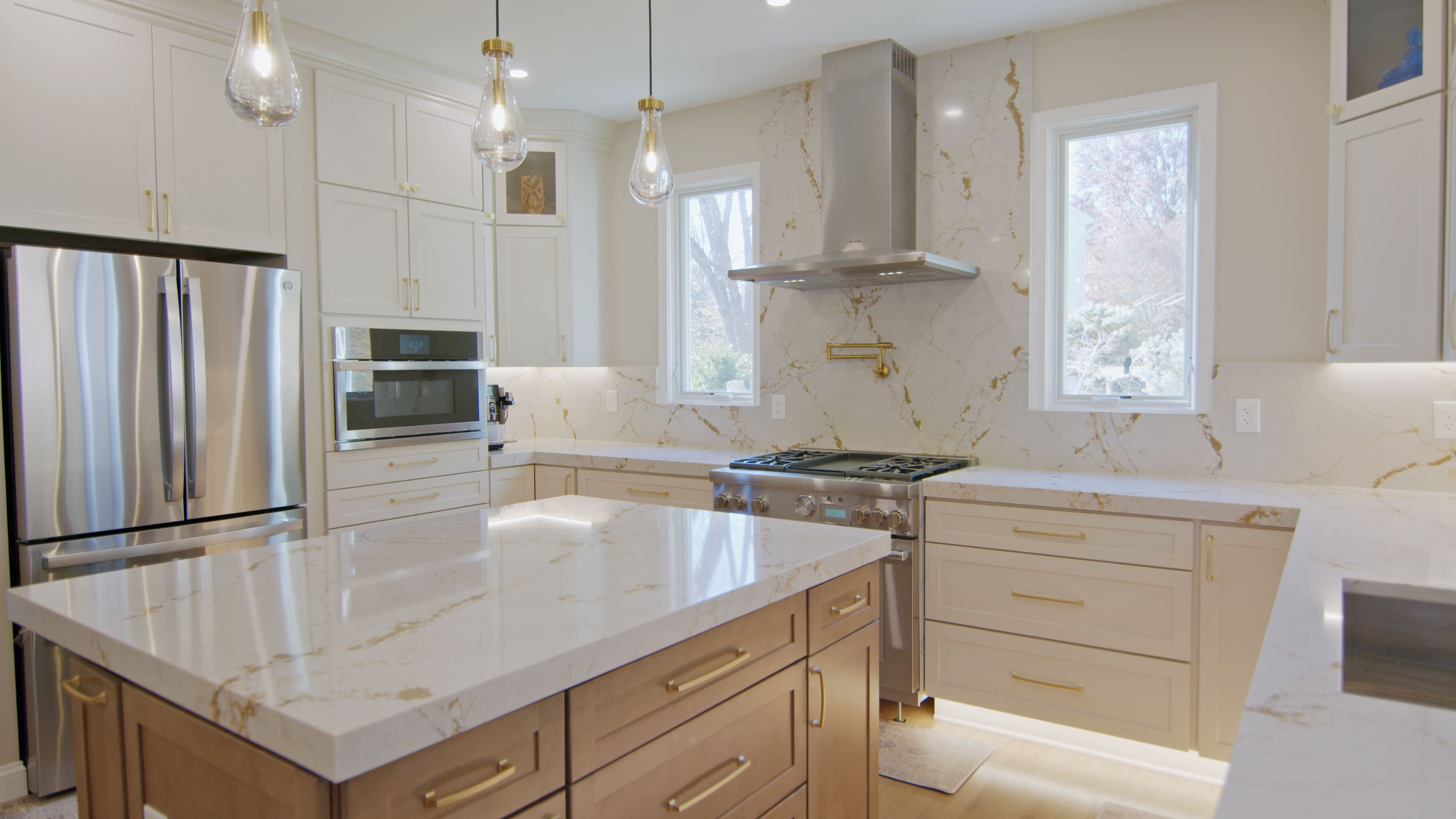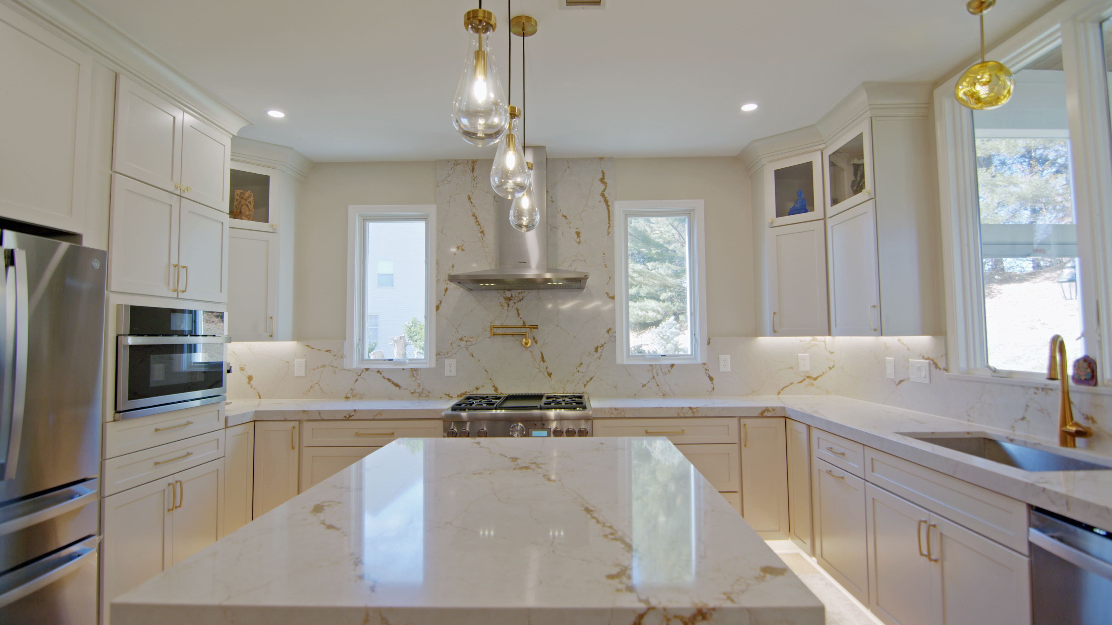 This elegant kitchen features white cabinetry paired with gold hardware, fixtures, and a matching faucet, creating a refined and timeless look. The brown-toned island adds warmth and serves as a beautiful focal point. Under-cabinet lighting and stylish fixtures enhance the space, making the kitchen feel bright and inviting.