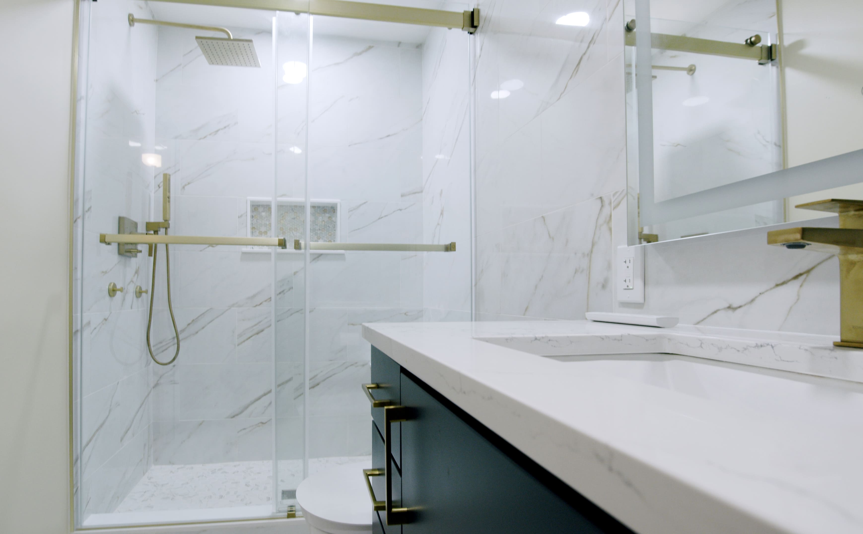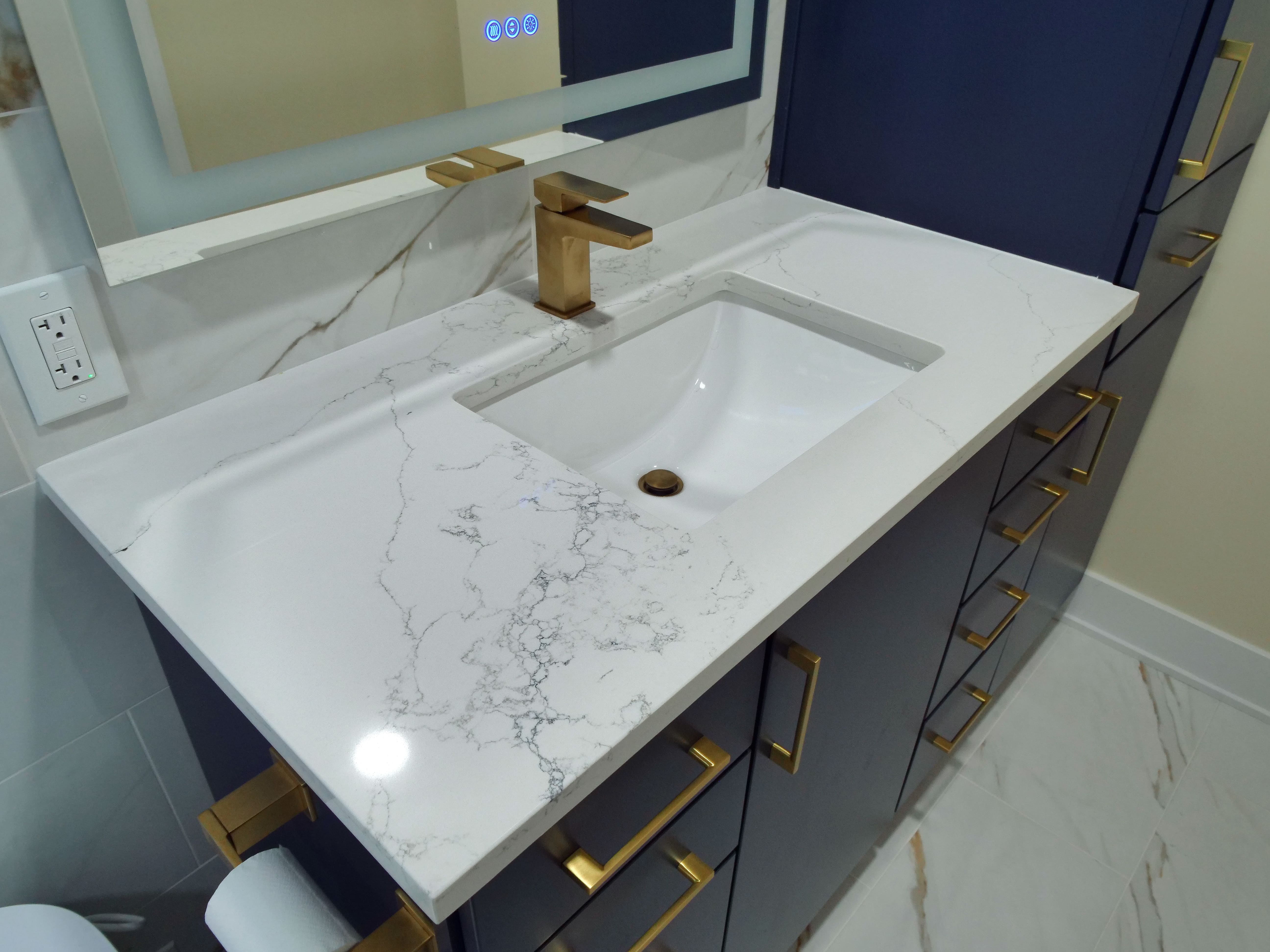 This bathroom features stunning blue cabinetry paired with gold faucets and matching handles, creating a luxurious yet functional space. The illuminated mirror adds both style and practicality, while complementary tiles complete the design, enhancing the overall aesthetic.