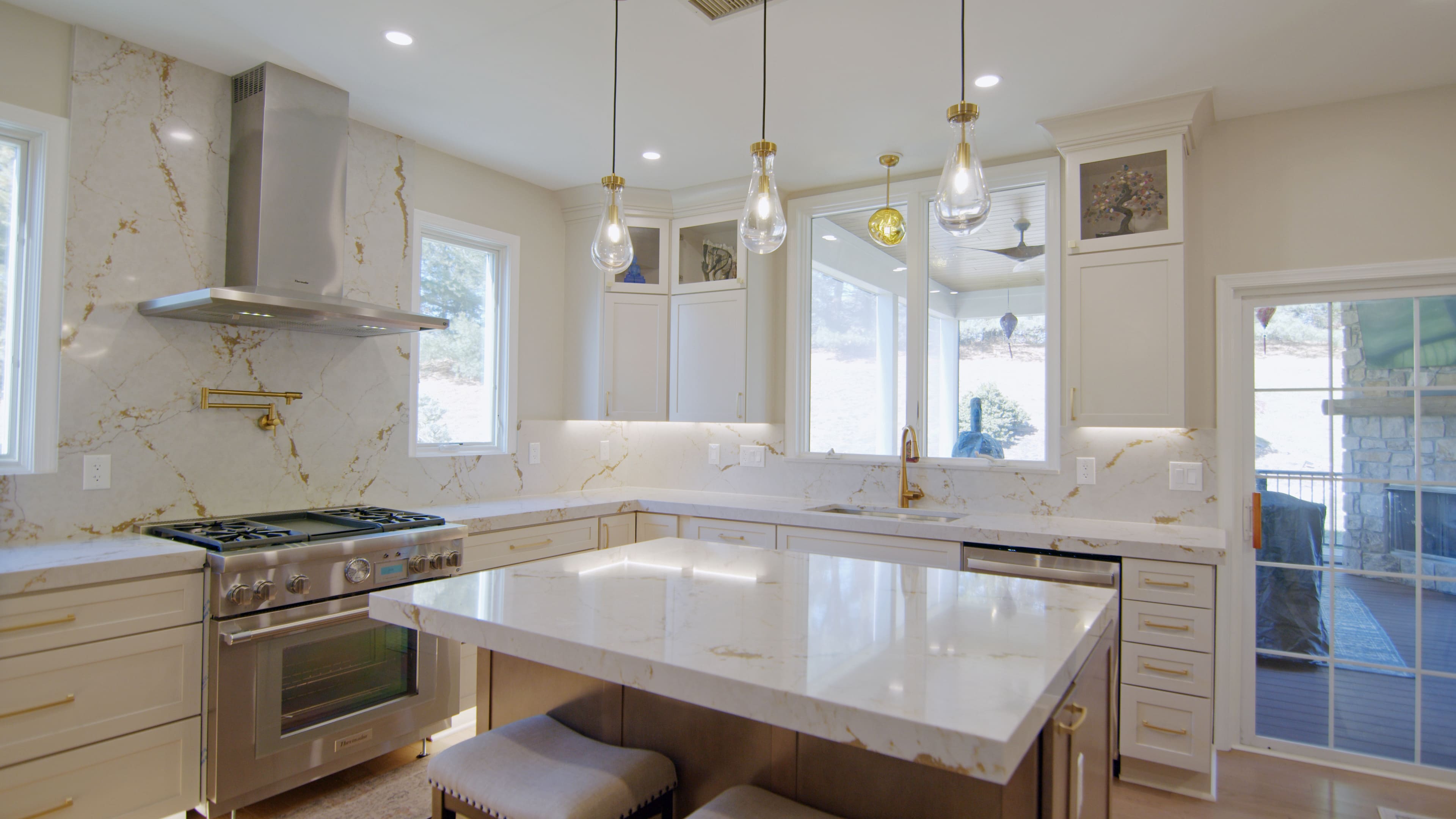 This elegant kitchen features white cabinetry paired with gold hardware, fixtures, and a matching faucet, creating a refined and timeless look. The brown-toned island adds warmth and serves as a beautiful focal point. Under-cabinet lighting and stylish fixtures enhance the space, making the kitchen feel bright and inviting.